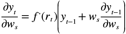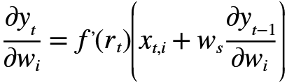 yt-1, yt sırasıyla t-1 ve t zamanlarındaki çıkışları, xt,k t zamanında k’nıncı bağlantının girişini, wk k’nıncı ileri besleme bağlantısından bir başka nörondan gelen geçerli ağırlığı, ws kendi-rekurrent bağlantısının ağırlığını ve f ise aktivasyon fonksiyonunu göstermektedir. Aday eğitim süreci boyunca takip eden türevler kullanılır,