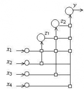 Örnek olarak Şekil 3 m=4 girişli ve r=3 katmanlı bir basamak ağını gösterir. Şekil 3’te tasvir edilen kareler sinaptik bağlantılarla beraber çıkış nöronu, z1 ve z2 çıkışlarıyla iki gizli nöron ve x1…x4 girişlerini göstermektedir.