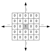 Bu resim ise dürtü fonksiyonunun 2D matris gösterimidir. Matriste 1 ile gösterilen yer merkez ve m = n = 0 noktasıdır.