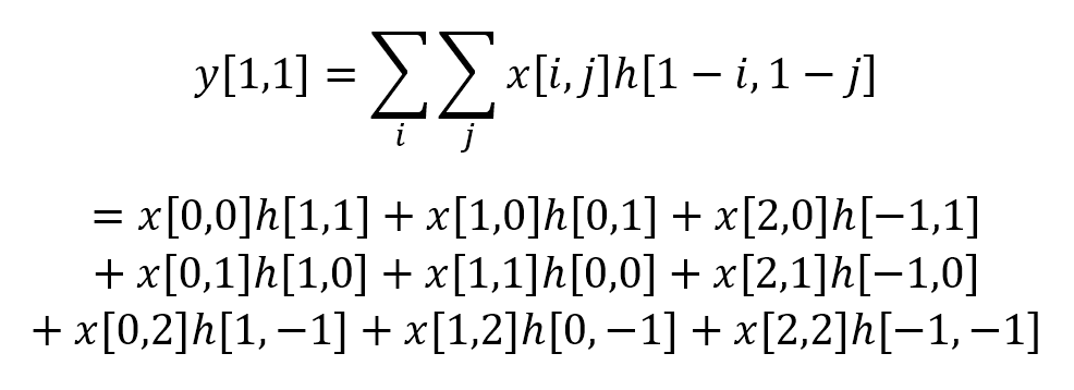 Şimdi rastgele bir nokta seçelim ve bu nokta için evrişimi hesaplayalım. Örnek olarak y(1,1) noktasındaki değeri hesaplayalım. Aşağıdaki verilen i ve j değerleri, filtrenin girdi üzerinde denk geldiği yerdeki konumlardır. Bu örnekte i değeri 0’dan 2’ye, j değeri de 0’dan 2’ye kadar değerler alacaktır.