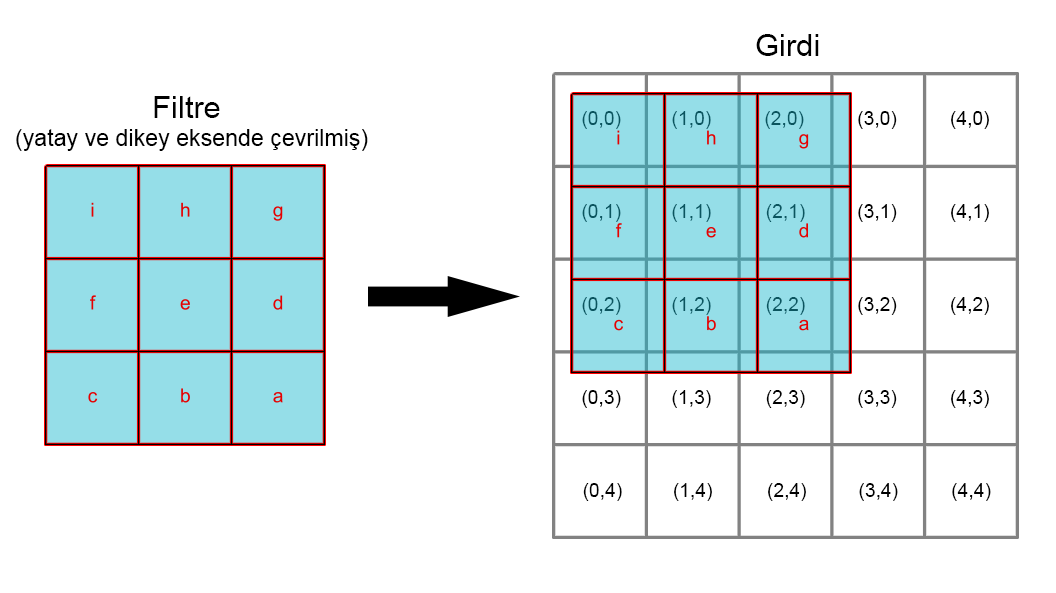Evrişim işleminde, koordinat parametreleri, filtrenin girdi üzerinde denk geldiği yere göre değişmekteydi. Çapraz korelasyon işleminde ise, filtremizin koordinatları i ve j değişkenleri olarak alınır. Yani yukarıdaki örnek için, evrişim işleminde i ve j değerleri 0’dan 2’ye kadar değişirken, çapraz korelasyon işleminde bu değerler -1’den 1’e kadar değişmektedir (filtremizin konumlandığı şekilde).