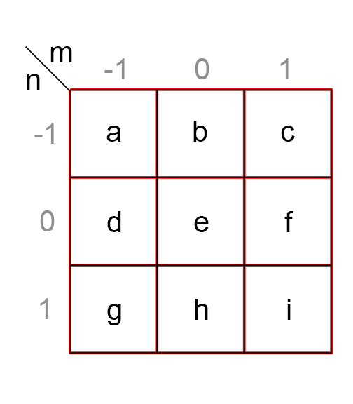 Filtre, 2D uzayda, merkezi orijinde olacak şekilde konumlanır. Yandaki resimden örnek verirsek, e noktası h[0,0] noktasında konumlanmıştır, a noktası ise h[-1,-1].