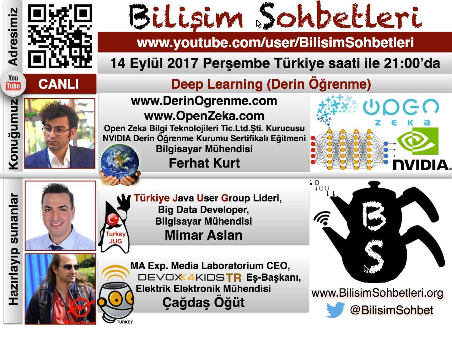 14 Eylül 2017 Perşembe Türkiye saati ile 21:00’da Bilişim Sohbetleri canlı yayınında “Deep Learning (Derin Öğrenme)” üzerine konuşma yapacağım.